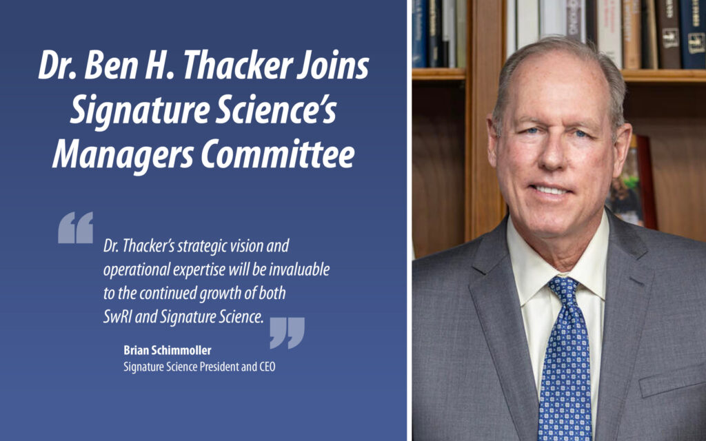 “We congratulate Dr. Thacker on his well-deserved promotion at SwRI, and we could not be happier to have him join our Managers Committee,” said Brian Schimmoller, President and CEO of Signature Science. “Dr. Thacker’s strategic vision and operational expertise will be invaluable to the continued growth of both SwRI and Signature Science.”